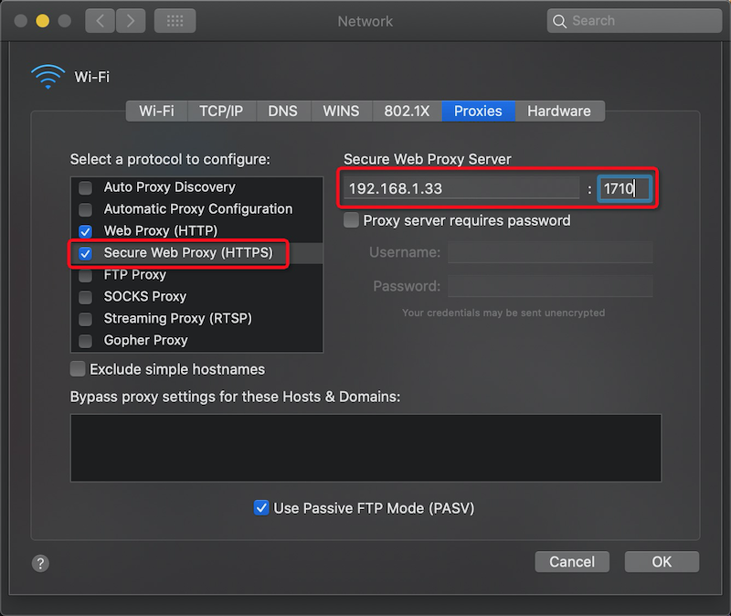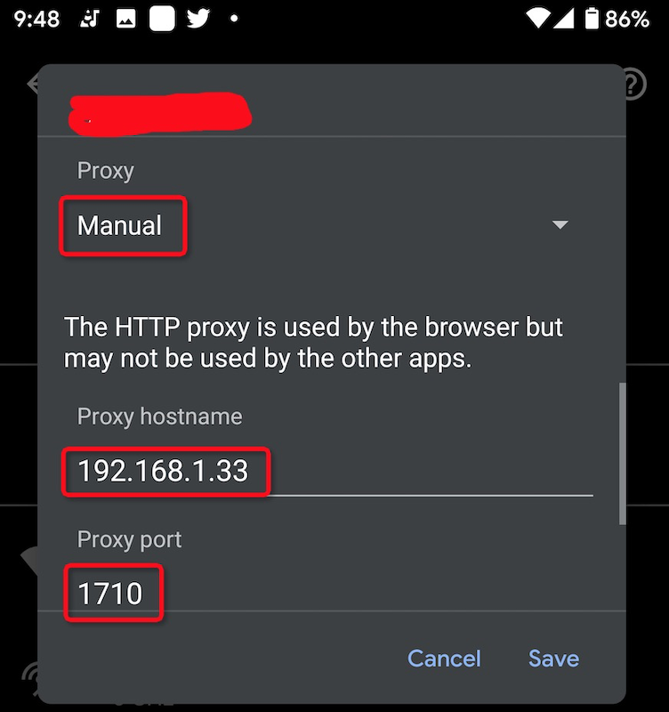 然后在 Proxy 设置下拉选择 Manual 并填写相应的Proxy服务器设置: