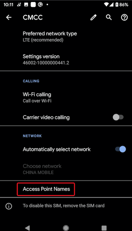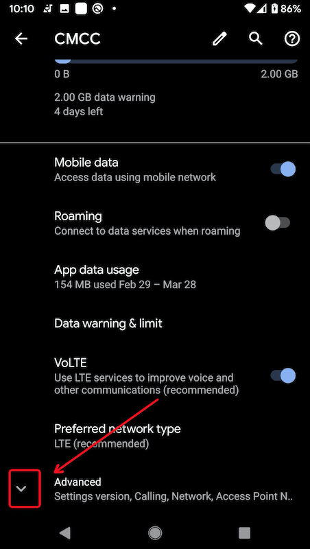 Settings => Network & internet,或者在设置快捷栏中长按Mobile Data图标,进入移动运营商设置页面。例如,我的设置是中国移动CMCC向下滚动菜单页面,在最下方有一个