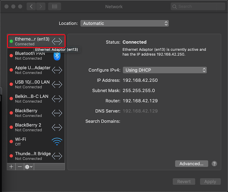 安装完 HoRNDIS 驱动以后,需要重启一次macOS,重启以后,将启用了 USB tethering 设置的Android手机通过USB数据线连接到Mac电脑上,此时在Mac的 Networks 设置中会看到一个 Etnernet Adaptor :