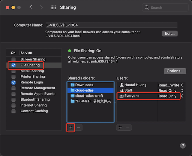 需要注意,默认添加的 Shared Folders 会有一个 Everyone 的 Read Only 共享,如果不是你期望的配置,需要将这个 Everyone 的配置修改成 No Access (因为 Everyone 不能删除)。上图中的 Staff 用户组是本人账号 Huatai Huang 所在的用户组,默认是 Read Only 。