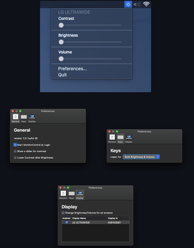 亮度图标进行操作,如上截图。建议在Perference中开启登录时启动以及启用对比度调整。这样就无需再使用显示器蹩脚的按钮调整功能了。