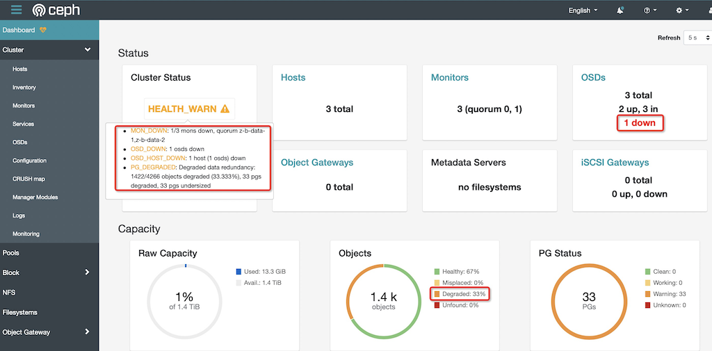 并且从 Ceph Dashboard 管控面板 可以清楚看到 1/3 节点故障: