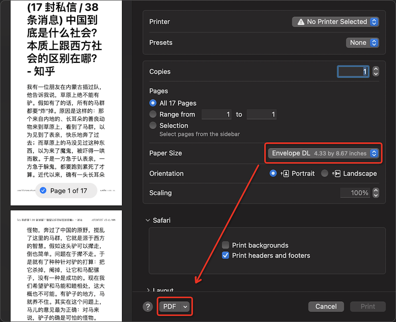Reader View方式阅读WEB页面,也就是摈弃掉所有不需要WEB元素,生成一个非常干净的阅读页面,这个页面是可以直接打印保存为pdf文件的在保存pdf时候,一定要选择合适的打印页面格式: 原来pdf打印是根据目标页面来排版的,实际上选择更适合手机屏幕的纸张格式就可以。经过尝试,我发现 macOS 内置的