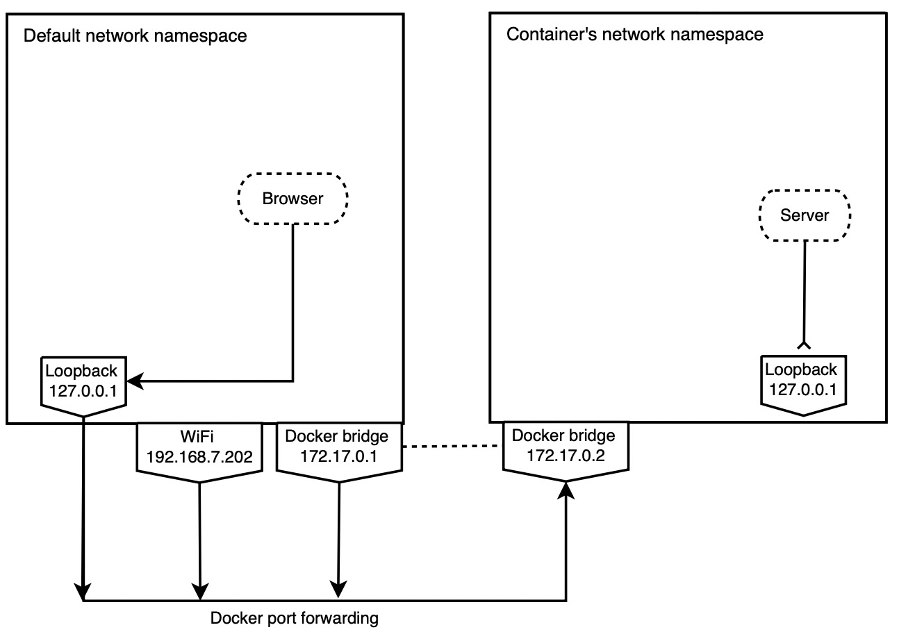 这使得容器内部应用程序只监听回环地址;而 docker run 的 PUBLISH 指令是映射到容器内部的虚拟网卡上,所以无法访问。