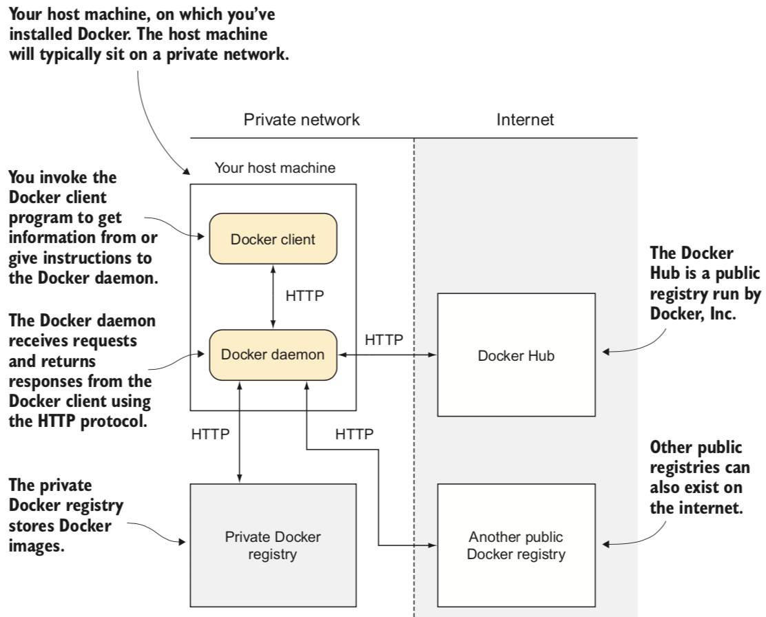 Docker daemon是Docker交互的中心,也是理解相关Docker概念的起点,它管理这容器和镜像的状态,并且是和外部世界交互的代理: