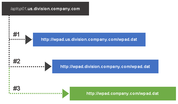 laptop01.us.division.company.com,则浏览器会尝试使用以下URL来找到为这个客户端提供域名的代理配置:http://wpad.com/wpad.dat (现代DNS查询已经屏蔽过滤掉这个查询,避免有恶意注册 wpad.com 域名)