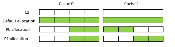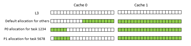 上述修改以后,分配到 p0 资源组的进程,就只能分配到 cache ID 0的低位50% (3) 和 cache ID 1的高位50% (c) ;而分配到 p1 资源组的进程,就能够使用两个socket中缓存的低位50% (都是3) 。