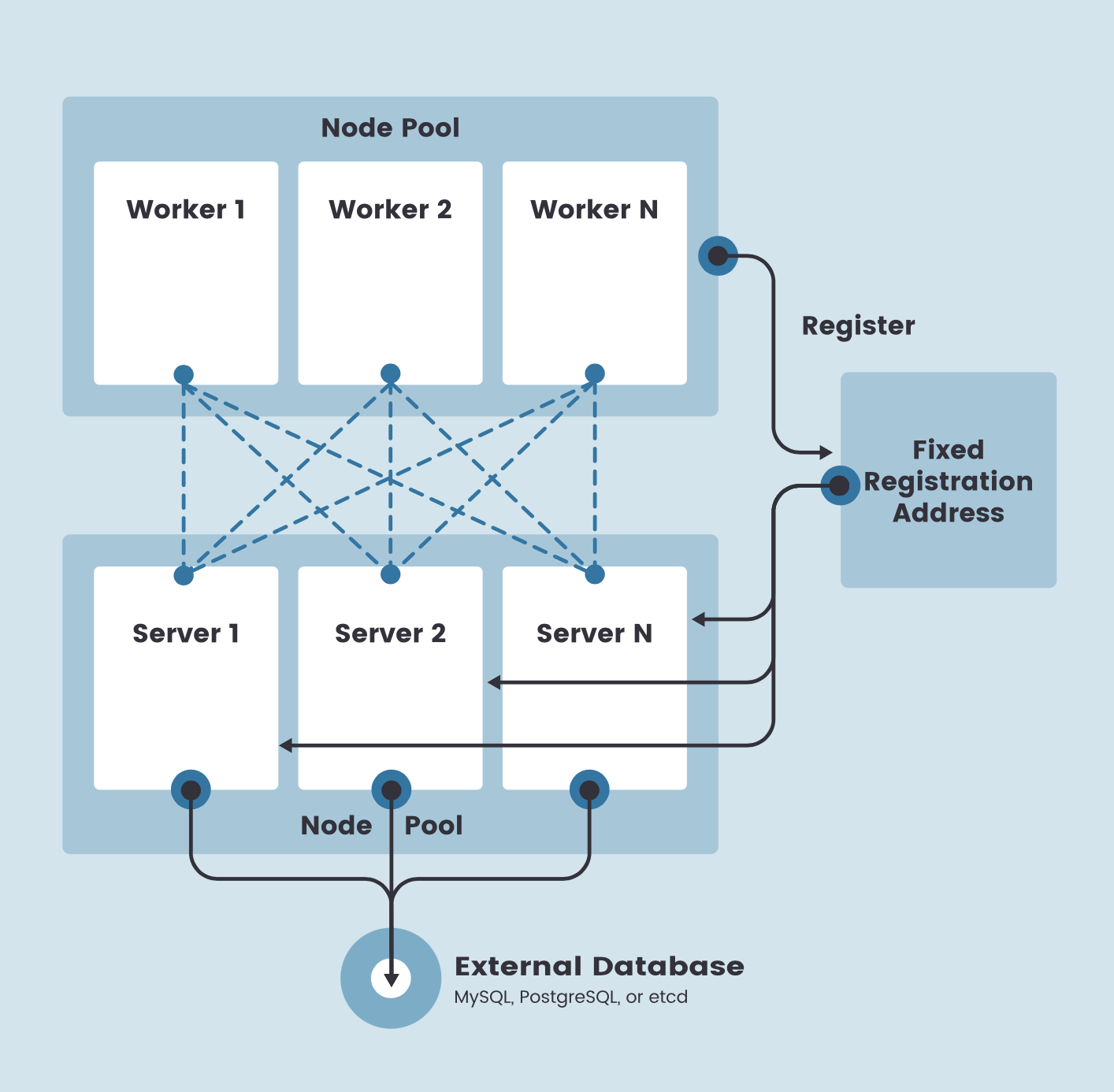 fixed registration address可以是DNS(其实就是DSN轮转)或者负载均衡(负载均衡到API服务器)通过DNS轮询(相当于负载均衡)agent可以注册到K3s API server上