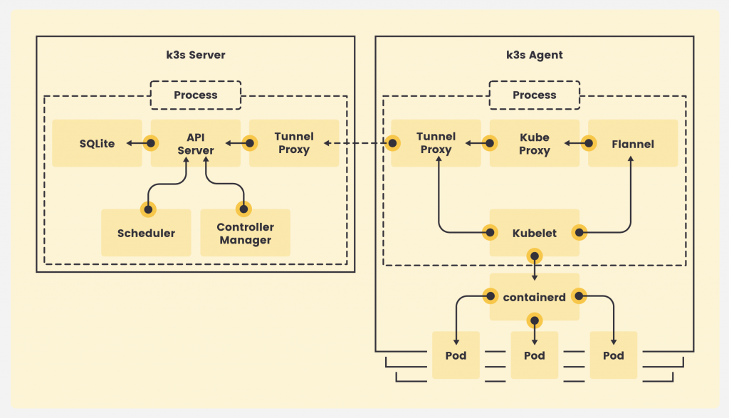 在 server 和 agent 上都有容器运行时( container runtime ) 和对应 kubeproxy 来管理集群间的网络流量和tunneling。