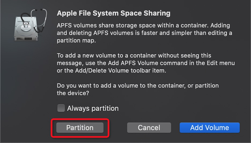 注意一定要添加分区,不能添加卷。添加卷实际上是macOS APFS文件系统内部的子卷,只有添加分区才能收缩现有的macOS所在分区。