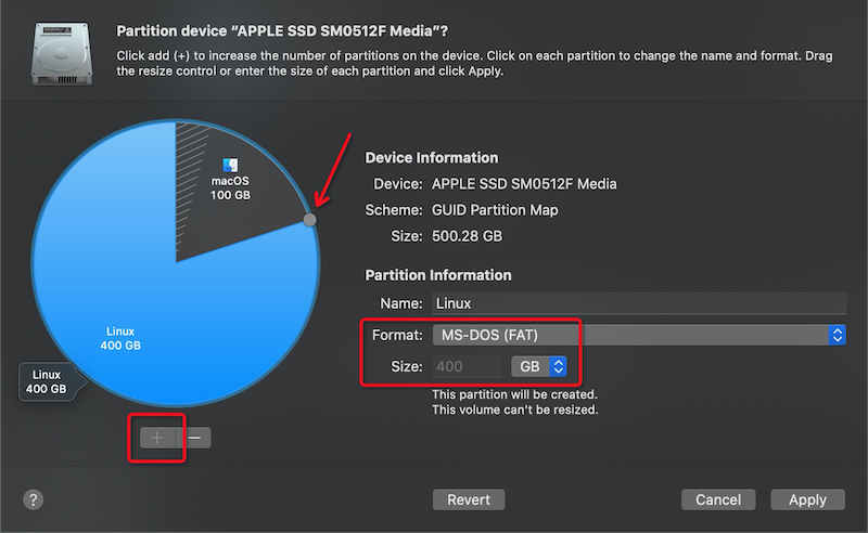 +按钮添加一个分区,然后按住以下截图中饼图上箭头所指的调整分区的圆点旋转调整两个分区的大小。例如,我调整Linux分区到400G,保留Mac分区100G。