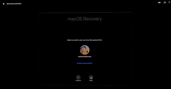 第一次启动会进入 macOS Recovery屏幕,在Recovery屏幕,选择你的名字,点击