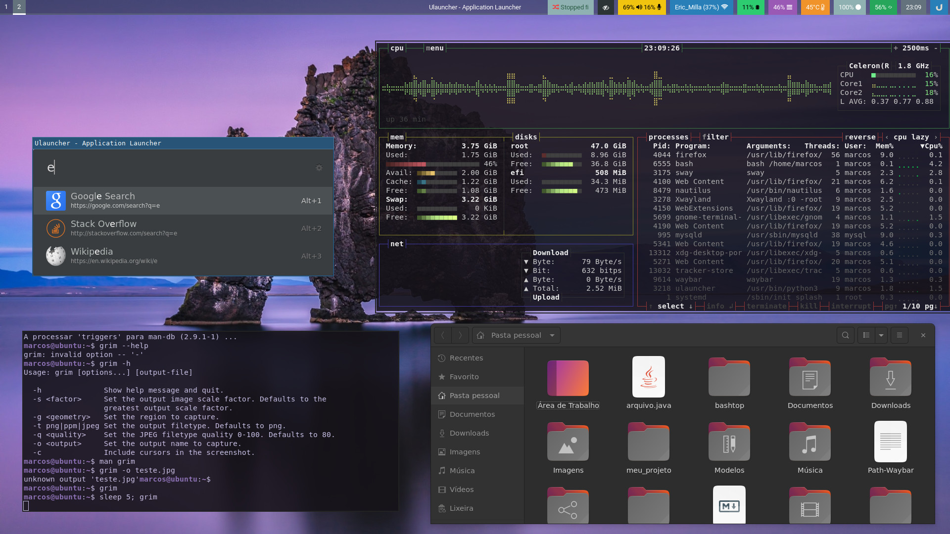 参考 Arch Linux的Manjaro发行版,Manjaro Sway包含了在底部共用键盘快捷键的对话框,并且使用应用程序launcher(Wofi)来使用快捷键。可以结合一些轻量级应用来完成日常工作:
