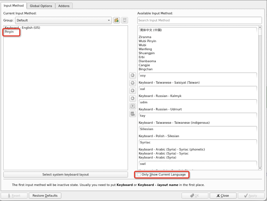 Pinyin作为中文输入法(注意,需要先去除Only Show Current Language勾选才能显示出中文输入法)