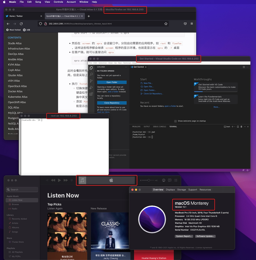 在 macOS 12.1 Monterey 上,可以同时操作远程服务器上GUI程序(如 Firefox, VS Code)和本地的macOS各种应用程序