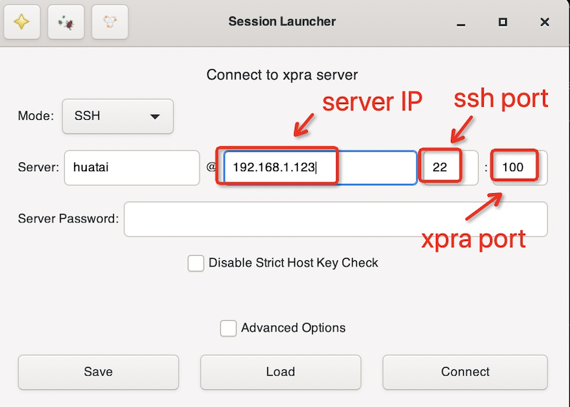 macOS早期旧版本xpra不能直接使用 xpra 命令行。提供的图形界面Xpra,理论上应该是SSH服务器的22端口,访问的xpra是 :100 ,配置如下: