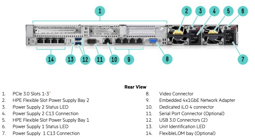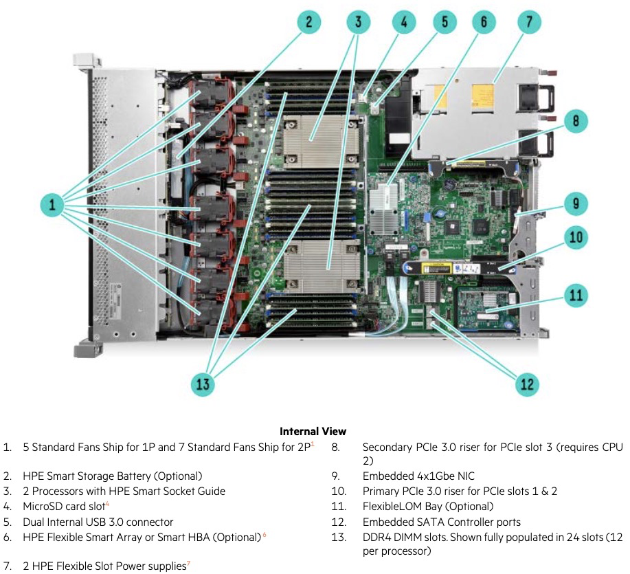 可选的 FlexibleLOM Bay 网卡有多种规格,千兆、万兆甚至25Gb。常见的是Intel 4口千兆网卡 HP Ethernet 1Gb 4-port 366FLR Adapter (部件编号 665240-B21) 。