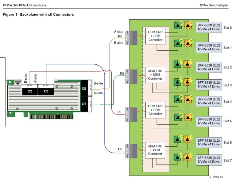 传统的RAID技术,在不断推陈出新的NVMe存储技术发展下,也出现了NVMe RAID卡,通过NVMe switch可以实现更多的NVMe设备直连。如果HBA卡没有提供内置的RAID功能,可以采用 Intel Virtual RAID on CPU (Intel VROC) 技术,实现全速率的NVMe组件RAID。在使用PEX88048主控芯片的NVMe Switch Adapter (Broadcom P411W-32P),默认将PCIe 4.0 x16拆分成 4个x8 SFF-8654接口: