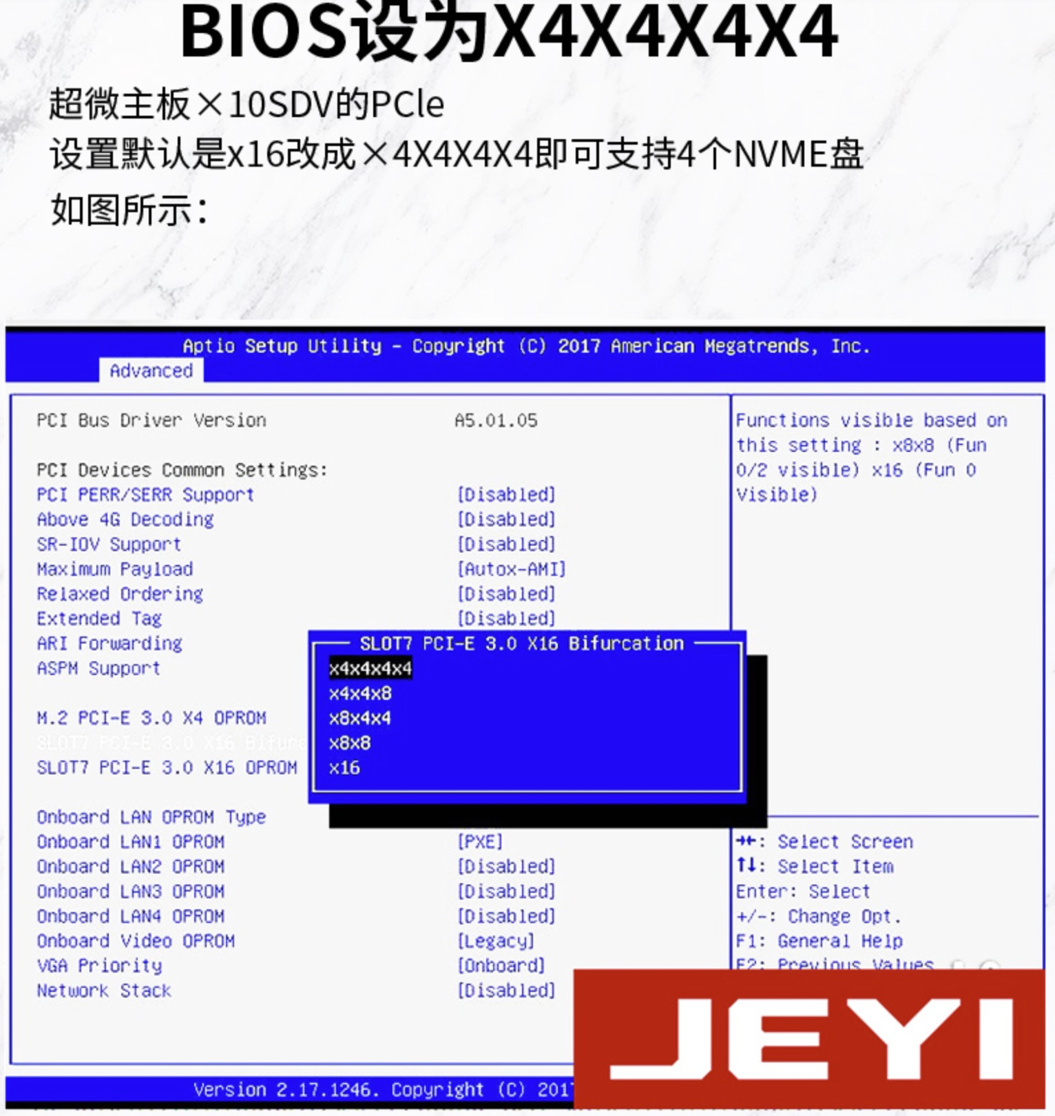 HPE Proliant dl160 gen9 bifurcation 中答复中也提到了,这个功能需要扩展卡厂商支持firmware,有人换了6个扩展卡都没有看到BIOS能够显示出 PCIe Device Configuration 配置项。