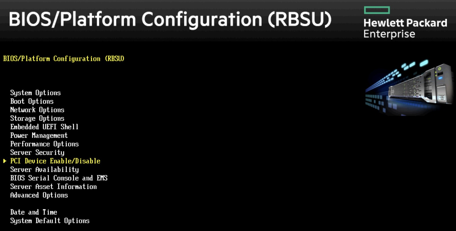 BIOS/Platform Configuration(RBSU)配置选项,依然没有看到PCIe Device Configuration配置入口(只看到PCI Device Enable/Disable激活关闭设置):
