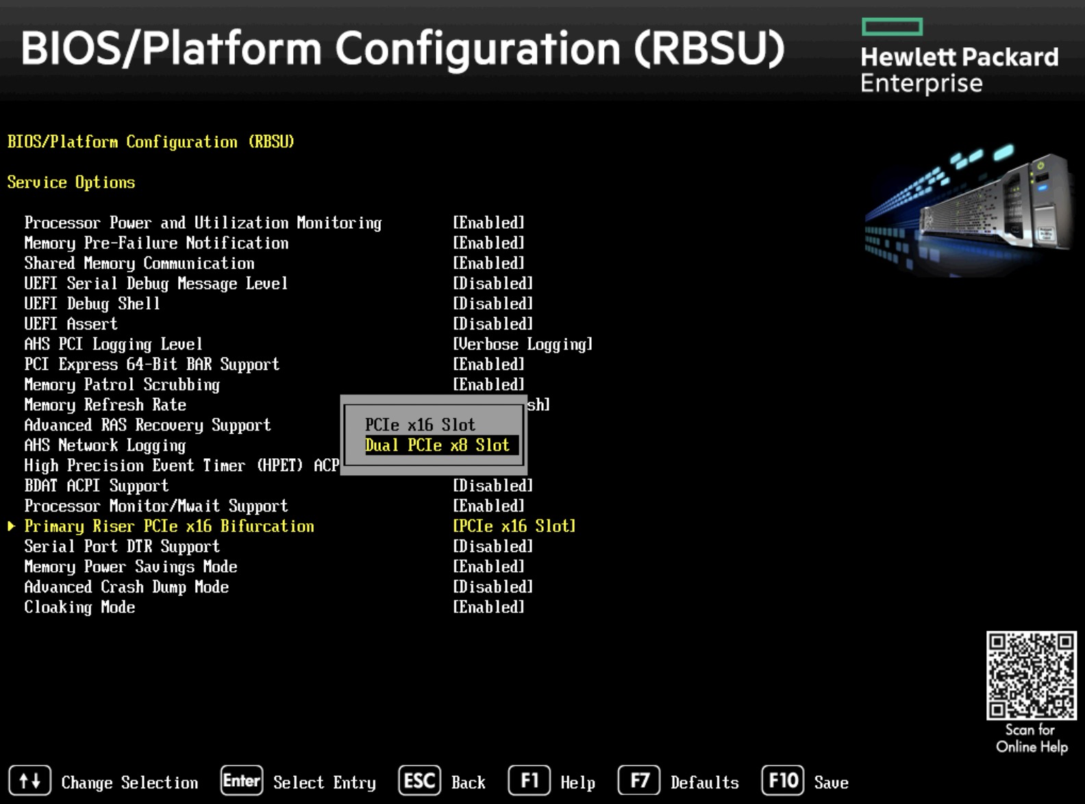 pcie options选项,不过,dual bifuration支持是从 2016 年开始的,在 HPE UEFI System Utilities and Shell Release Notes for HPE ProLiant Gen9 Servers 文档第5页(2016年文档)有说明:Addedsupportto configurethe systemto bifurcatePCIe Slot 1 on the DL360Gen9 or PCIeSlot 2 on the DL380Gen9