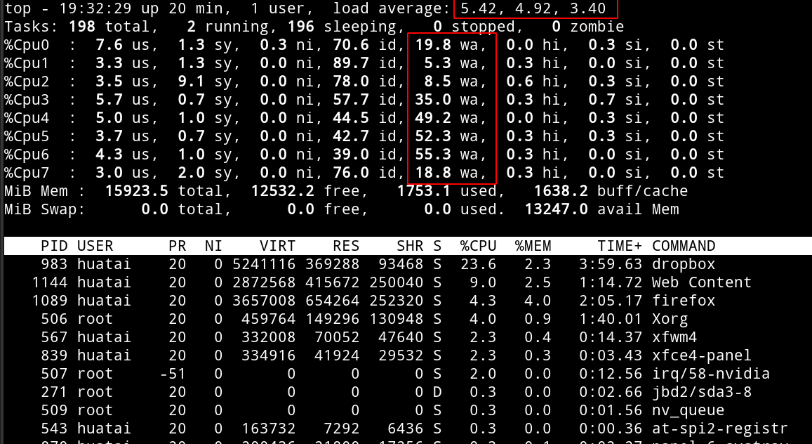 在 MacBook Pro上运行Arch Linux 遇到一个奇怪的问题,磁盘性能似乎极差,特别是当启动 Dropbox 同步网盘数据之后,虽然dropbox网络流量极低,但是 top 检查 iowait 非常高导致系统相应缓慢: