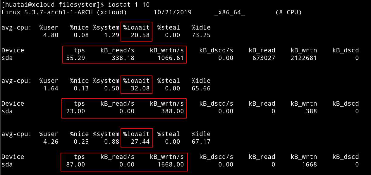 但是,通过 iostat 检查却发现磁盘读写非常小,完全达不到SSD的性能: