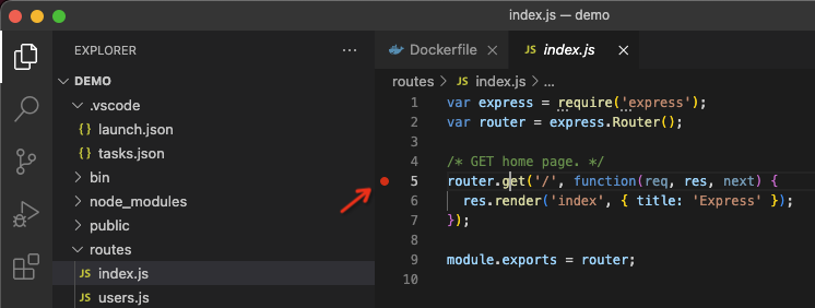 routes/index.js文件中找到 处理'/''的get(),在这行代码行号左方点一下,增加一个断点 (breakpoint)