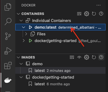 Run(也可以选择Run Interactive) 此时可以看到终端运行命令:docker run --rm -d -p 3000:3000/tcp demo:latest